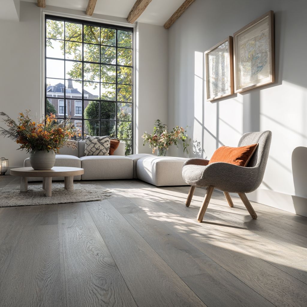 Voorbeeld zoals afgebeeld is afgewerkt in een hardwaxolie met een grijze kleur Nr.11